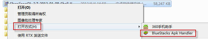 下载完整的apk文件,右击apk图标,选择打开方式--BlueStacks APK handler安装
