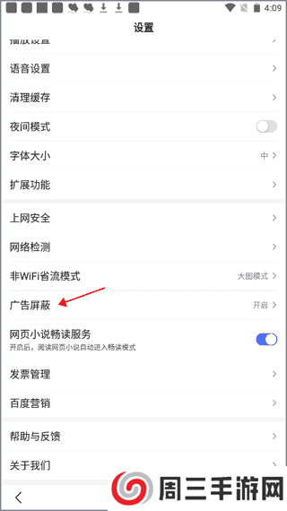 3、往下翻,会看到一个功能“广告屏蔽”,点击进去。