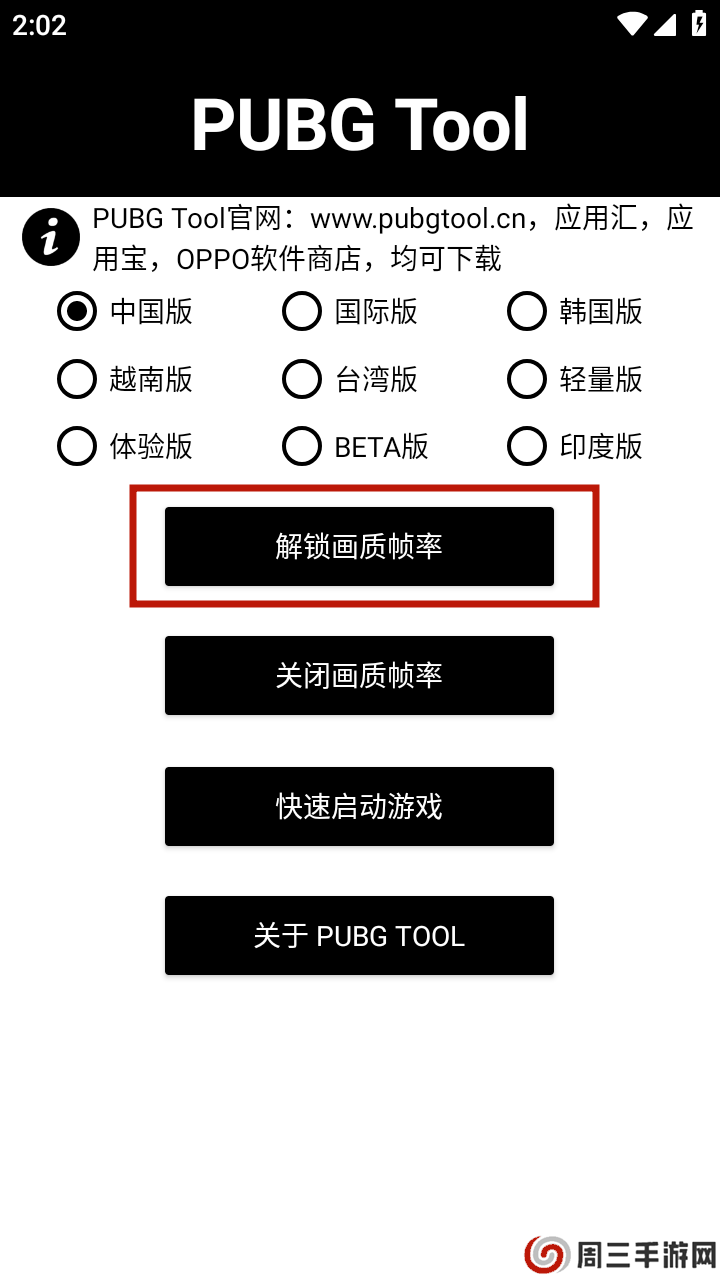 1、下载安装好地铁逃生画质修改器,并打开,根据您要修改画质的PUBG勾选正确的游戏版本,点击主界面的【解锁画质帧率】。