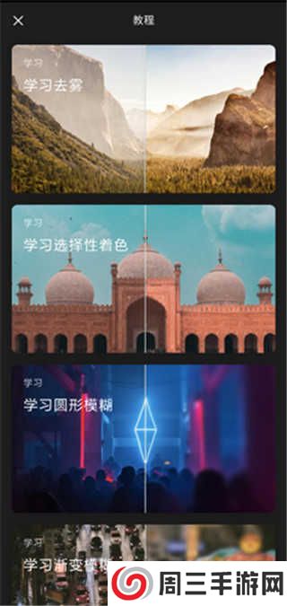 在引导教程面板下,一共包括了泼辣百科、学习去雾、学习白平衡、学习失真、学习曝光、学习全局调整、学习圆形调整、学习渐变调整、学习选色调整、学习笔刷、开始使用、键盘快捷键十二个选项。
