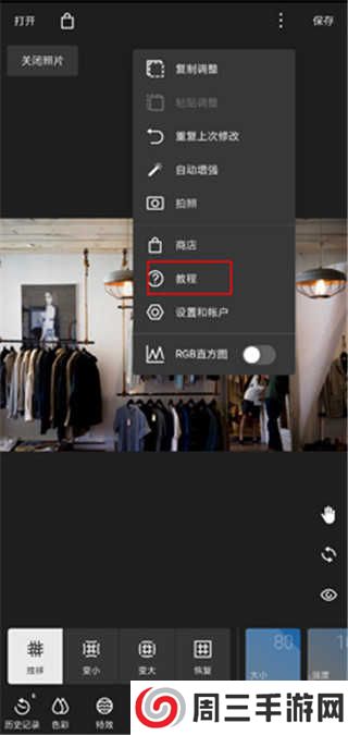 开始使用:当点击此选项后可以通过互动教程演示了解泼辣修图的基础使用方法,例如如何使用滤镜、如何调整参数等。