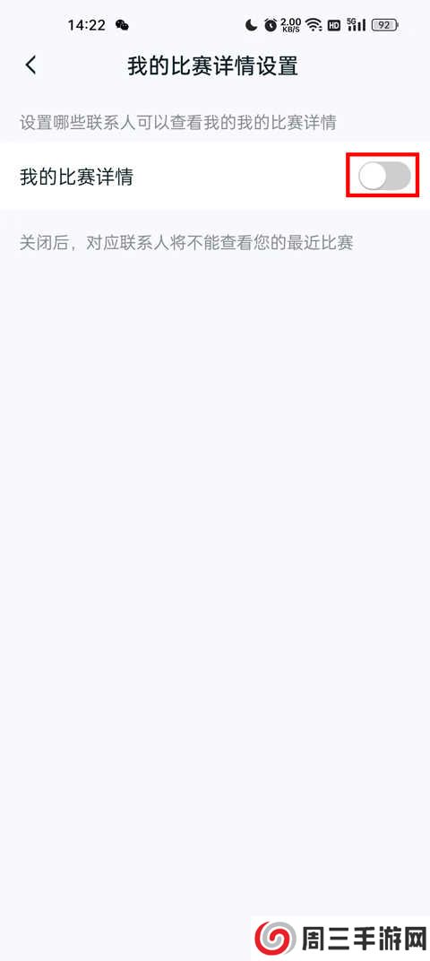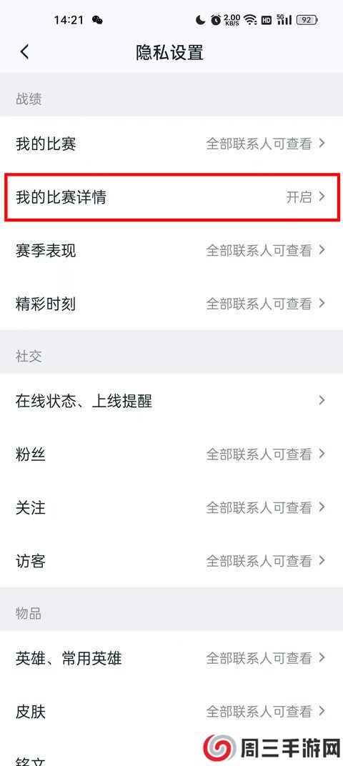 4、进入到隐私设置页面之后,在战绩板块中找到我的比赛详情进入;