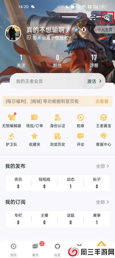 2、进入到我的个人页面之后没在右上角找到设置按钮进入;