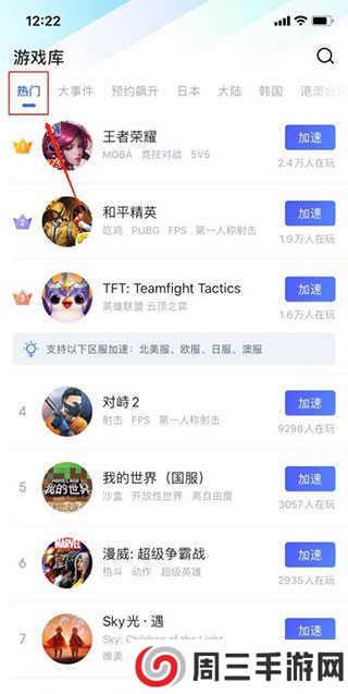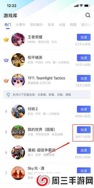 支持LOL手游、吃鸡国际服、王者国际服、云顶手游、Apex英雄、闪耀暖暖、文明重启、荒野乱斗、七大罪~光与暗之交战~、游戏王 决斗连盟、狂野飙车9等热门游戏的多个区服加速!为数千款手游提供一键网络优化加速!