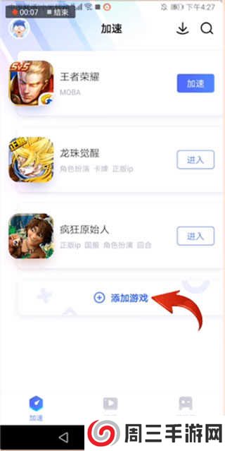 首先打开【biubiu加速器】APP,然后点击【添加游戏】;