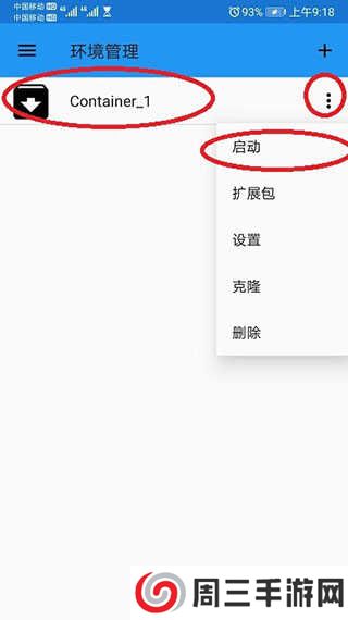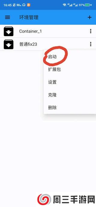 第三步、进入模拟器后,会出现一个空白的界面,你需要点击桌面左上角的三条杠,然后点击环境管理,在新的页面中点击三个竖着的点点,然后点击启动,就等待程序启动。