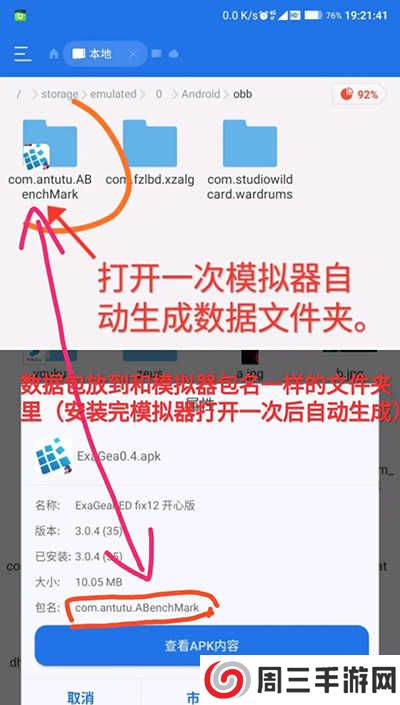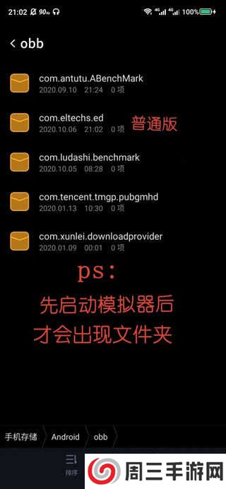 1、首先我们要下载好app和游戏数据包,并解压到图示“obb”文件夹里。