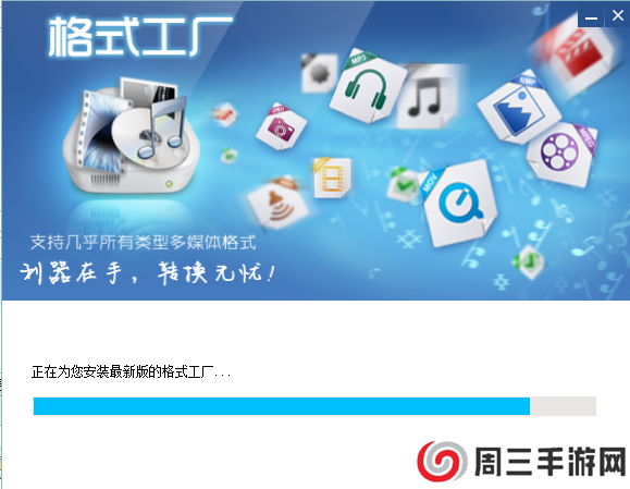 3.你点击一键安装选项后,格式工厂软件就开始安装了,如下图所示,你只需要等待安装进度条完成就可以进入下一个界面,安装速度是很快的,耐心等待即可。