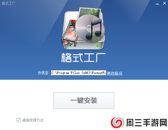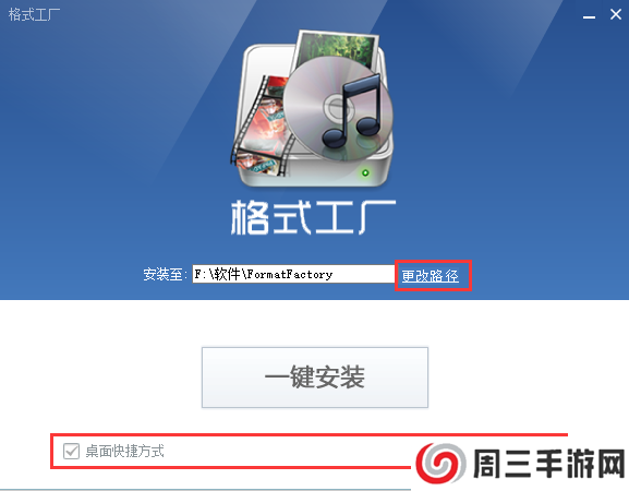 2.你有两种方式来安装格式工厂软件,你可以直接点击一键安装选项,软件会默认安装到系统C盘中,或者点击界面中的更改路径选项,然后在弹出的选项框中选择合适的安装位置,选择完成后在界面下方还有附加的桌面快捷方式和添加快捷启动栏两个选项,这个可以方便用户快速的找到并打开软件,建议你保留,最后再点击一键安装选项。(C盘为系统盘,软件过多会导致电脑运行变慢,所以软件一般选择其他盘进行安装。)