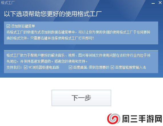 4.格式工厂软件安装进度条完成后,进入下图中的界面,在界面中有添加到右键菜单选项,可以方便用户快速代开软件进行使用,在界面下方还有附加的下载选项,你如果不需要的话可以取消勾选,然后点击界面下方的下一步。