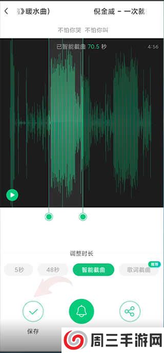 3、在点击下载并安装完应用裁剪应用之后,点击启动应用便可开始使用裁剪功能。在裁剪页面中拨动裁剪选项即可选择裁剪片段,同样也可以通过选择歌词片段来裁剪音乐,选择完成之后点击保存即可保存裁剪之后的音乐。