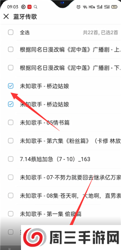 6、勾选要传输的歌曲,点击开始传歌,选择要发送的设备,等待对方选择接收即可成功