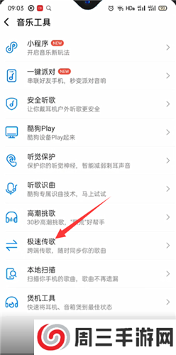 2、在音乐工具里面选择“极速传歌”,