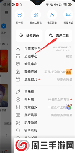 1、打开酷狗音乐,点击右上角的“三横”,接着点击“音乐工具”,