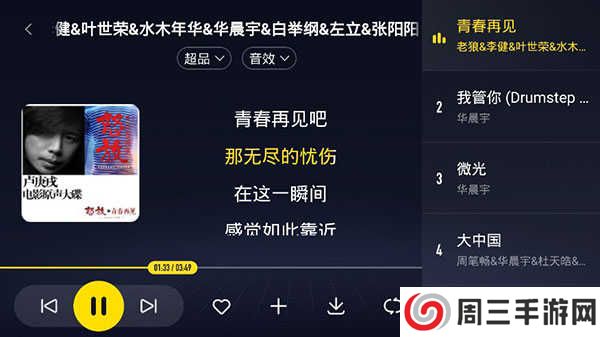 在播放界面,可显示词图、歌词,与其他单曲页面不一样的是,酷我音乐可以通过右上端最靠右的按钮来查找“相似歌曲”。