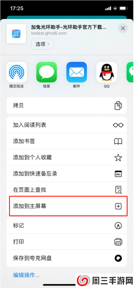 步骤三:当然如果你想要将光环助手其添加到手机桌面上,那么可以点击底部中间的“分享按钮”,箭头所指方向。