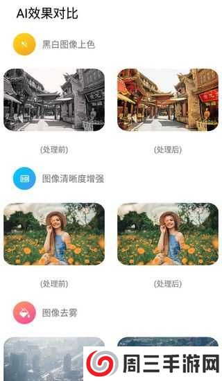 1、一键处理,图像识别、图像放大、图片上色、增强清晰度等等。