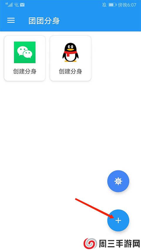 1、打开团团分身app,进入应用主界面,可看到默认有微信和QQ的创建分身选项,选择右下角【+号】图标,