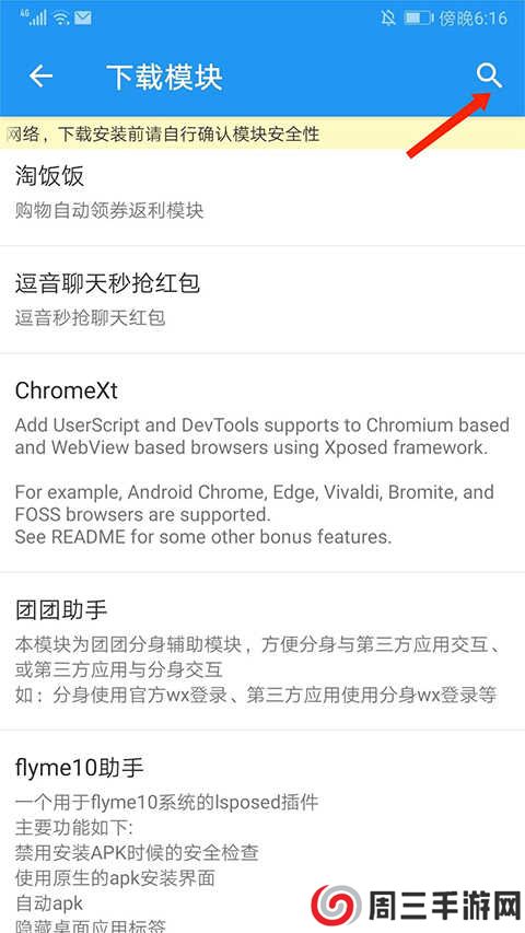 3、进入下载模块界面,选择右上角【放大镜】图标进行搜索,
