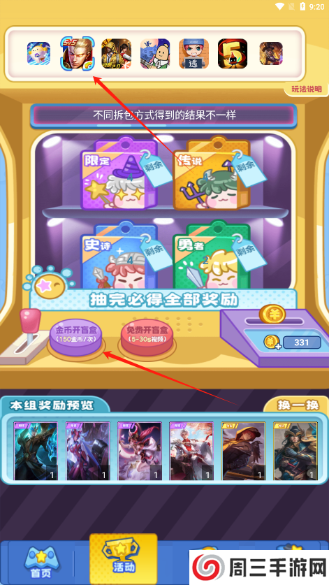 5、点击上面的游戏,在点击金币开盲盒或者是免费开盲盒(看