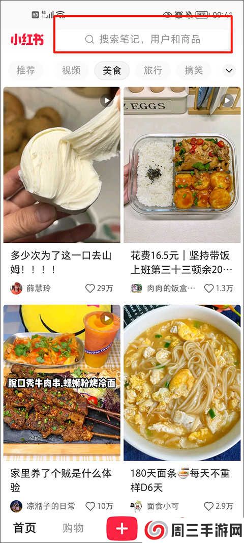 2、进入到软件后,可以选择上面的美食,进入到美食页面,就可以看到很多的美食分享,也可以选择右上角来搜索你想了解的美食。