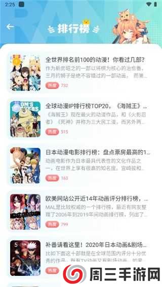 2、排行榜,总结归纳了近些年来排名靠前的动漫佳作,基本上都是动漫迷们自己选出来的,人气超高。