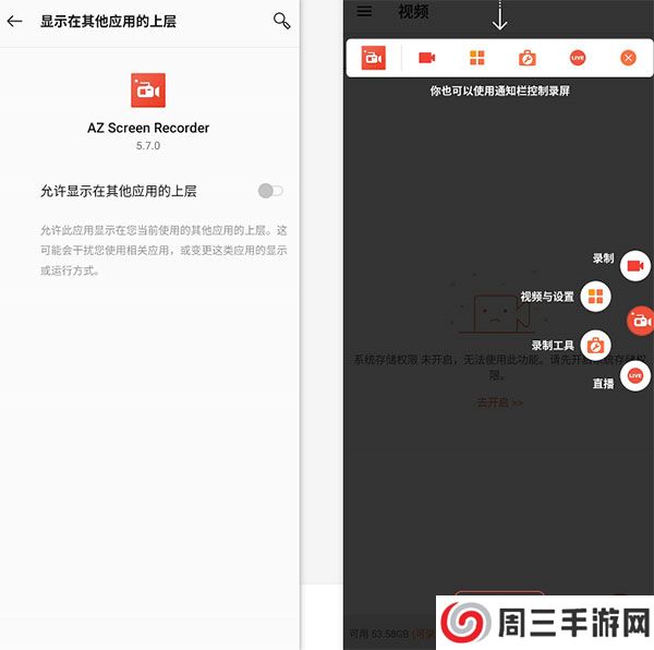 2、我们打开AZ屏幕录制,在下拉通知栏中可以看到软件的操作界面。