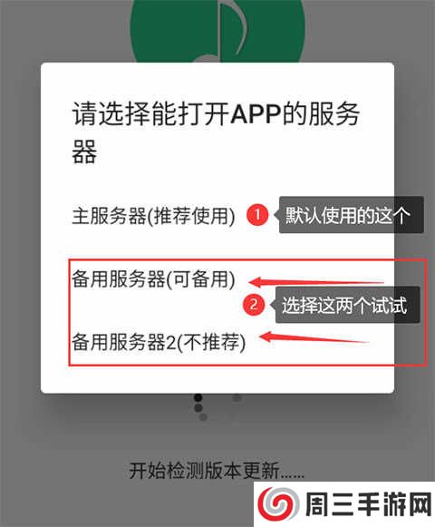 2、选择备用服务器 ,先关闭网络,打开APP会出现三个选项,打开网络选择备用服务器。