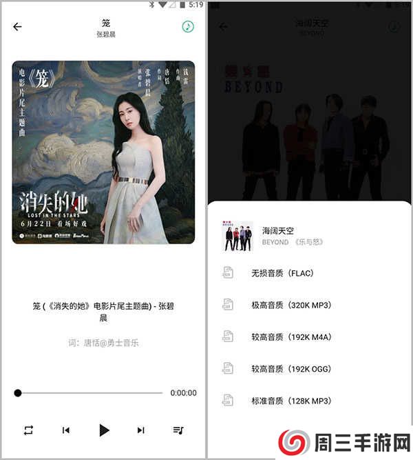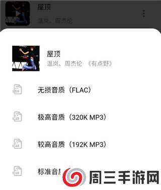 也可以点击直接进入播放器页面预览音乐,听起来不错可以直接下载本地,提供五种不同的音质,最高可选FlAC无损格式。
