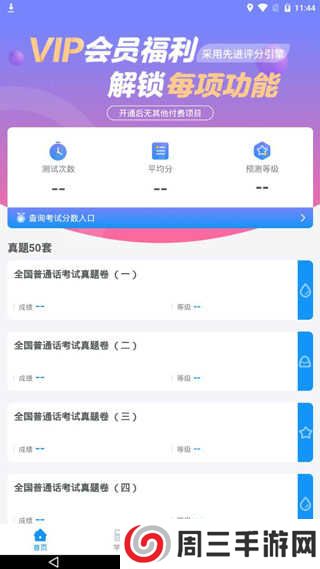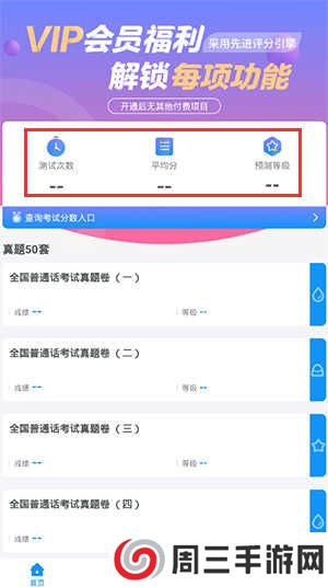 2、在首页,有测试次数、平均分、预测等级等,还有各种全国普通话考试真题试卷等;