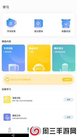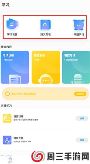 3、点开学习,有字词发音、短文朗读、命题说话等,还有专项联系、基础发音、模拟考试、语音训练等;