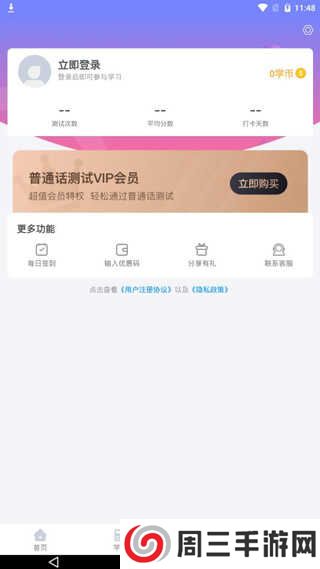 1、在本站下载安装普通话考试app,可以看到有首页、学习、服务、我的四个板块;;