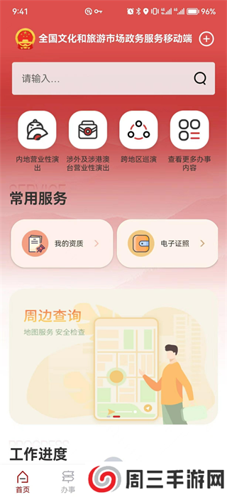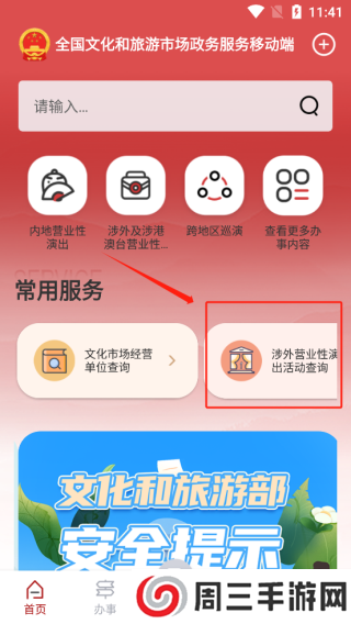 1、在当快下载安装文旅市场通,进入首页,找到常用服务中的“涉外营业性演出活动查询”