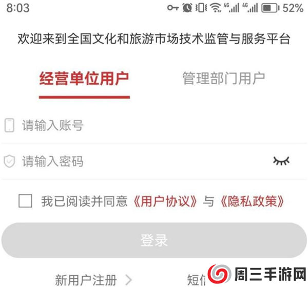 1、下载文旅市场通 APP,打开首页后点击任意操作按钮会跳转到登录页面,如果已在平台上有账号,请输入用户名密码进行登录。如果没有账户,请点击“注册”按钮,填写注册信息。注册成功后方可登录。