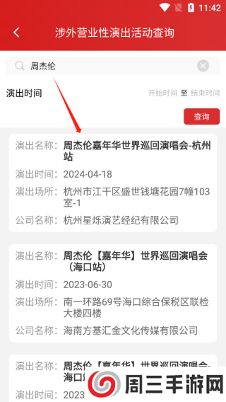3、如小编想看看周杰伦演唱会安排,搜索周杰伦,就可以看到在2024年04月18日周杰伦在杭州有演唱会!