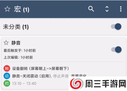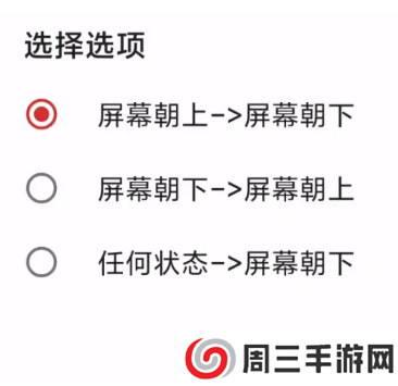 软件的触发器支持非常多的条件,这里来演示一下翻转屏幕自动静音(你也可以设定其他想要的操作)。选择好设备翻转触发之后,可以看到它会问你:是从什么状态变化的时候才触发。