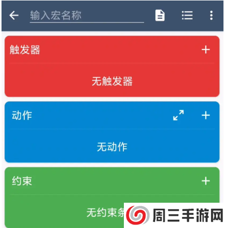 建立一个基础的功能,需要填写3个步骤,MacroDroid的触发器、动作和例外条件。