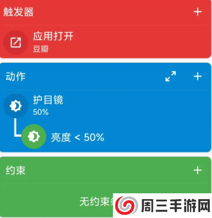 每个动作也可以单独加上限制条件,自动化软件最怕的就是在不想运行的时候自己操作,MacroDroid在这方面做得还是挺好的,响应速度也很快,像是到了夜晚打开软件自动开启护眼,这个就挺适合老司机熬夜啥的。