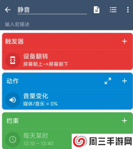 设定好限制时间,就能在指定时间,翻转一下手机自动静音了。在早上去公司的路上,也可以设定成在指定时间,连接上耳机的时候,自动打开某个软件并播放音乐。又或者是摇一摇切歌等,只要加好限制条件就能较少很多误操作。