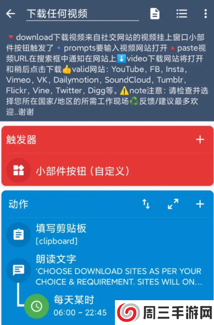 有了MacroDroid就能实现不少骚操作,像是在指定时间打卡什么的,在脚本模板里面可以看到这个软件有许多玩法,从充满电自己震动提醒到改造成一个自动下载器...上限很高。