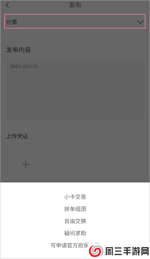 3、最后根据你的交换需要选择分类,填写内容、上传凭证,点击提交即可交换区显示。