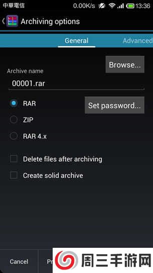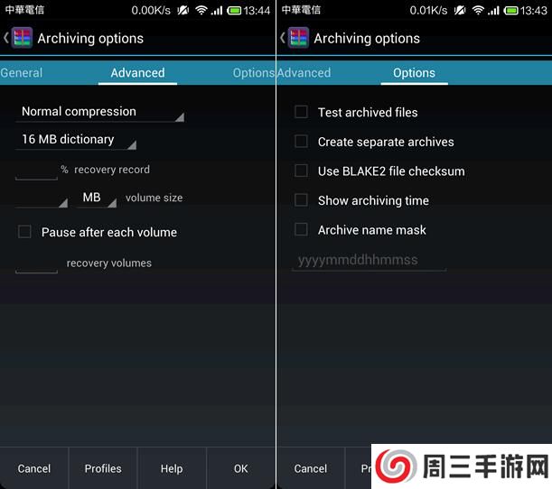 3、向左拨动到 Advanced 页籤,可选择压缩率等; Options 页籤可选择压缩测试、分割压缩档.....等。