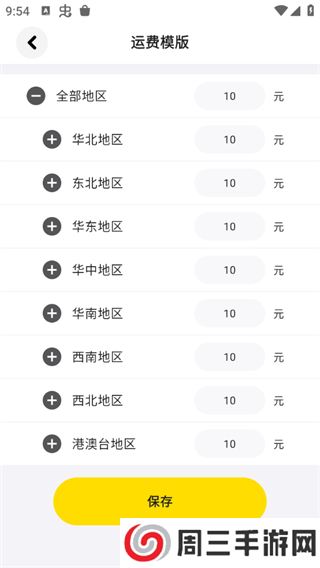 5.点击该选项后,根据提示在每个地区后面输入邮费金额,输入完成后,点击页面底部的【保存】或【确定】按钮即可完成设置。