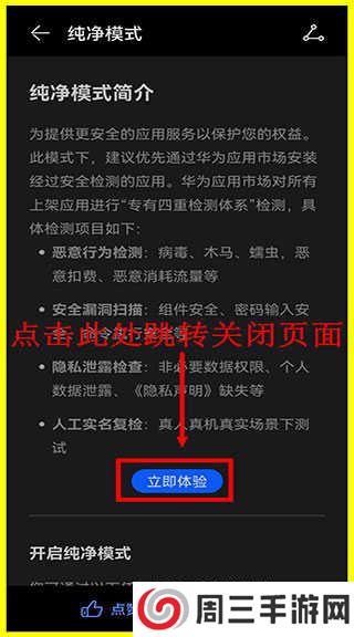 2、此处为纯净模式介绍,点击下方(立即体验)跳转关闭页。
