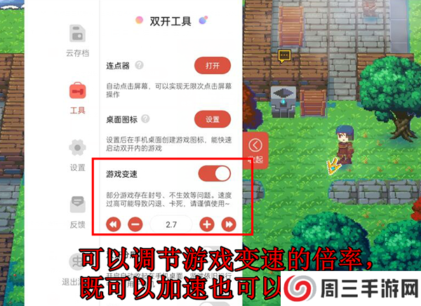 点击【悬浮窗】-【工具】-【游戏变速】,打开后可以调节游戏的速度,可以让人物走得更快,减少跑图、刷怪的时间了!