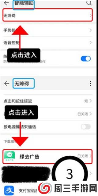 3、在进入【智能辅助】页后,找到【无障碍】;点击进入【无障碍】,找到【绿去广告】;