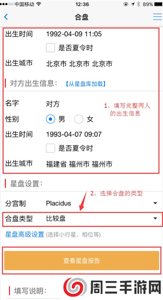 1、进入app“首页”,点击其中的合盘进入,输入需要合盘的两人的出生信息,然后点击“查看星盘报告”