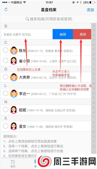 在档案条目上,按住条目往左滑动,即可显示对该条档案的操作菜单,你可以通过菜单对该档案进行编辑和删除操作