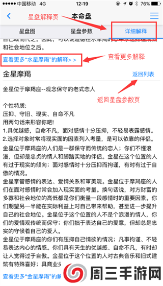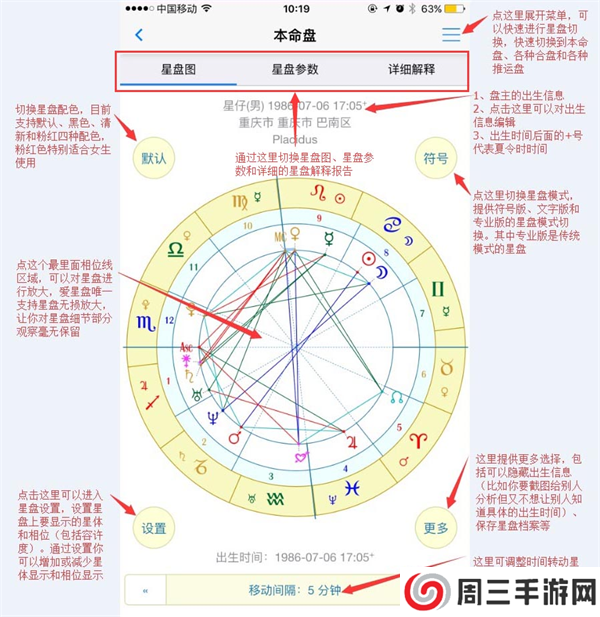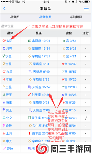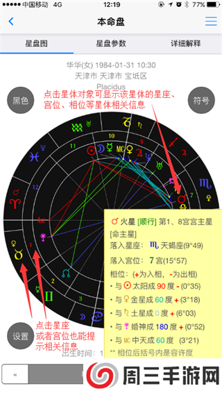 1、通过顶上的Tab选择或者手指左右滑动可以切换星盘图星盘参数列表和详细星盘解释二个内容