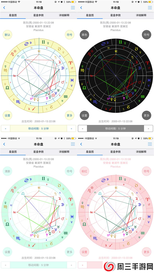4、多种星盘配色和样式,符号版、文字版、专业版三种模式,组合成128中星盘外观。